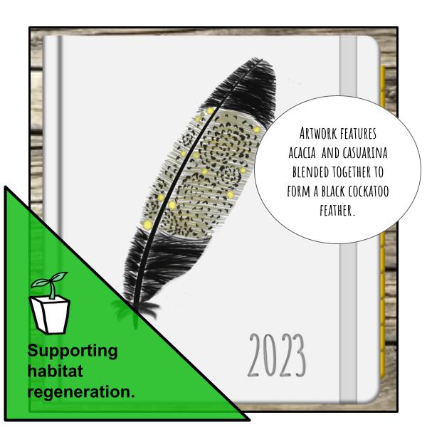 This digital diary artwork features, acacia and casuarina which blend together to form a black cockatoo feather. The flora included in the artwork are key in the habitat and diet of black cockatoos.